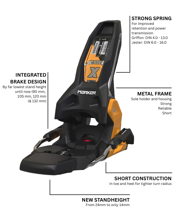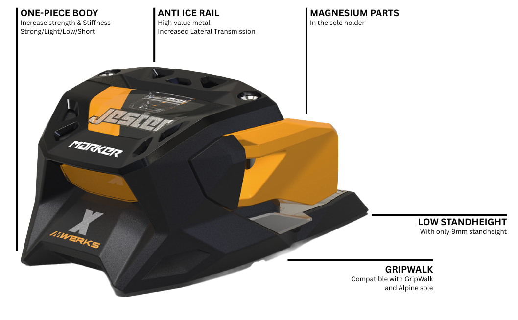 Marker Griffon X 13 MWerks er en alsidig freeride- og freestyle-binding, der er udviklet til let øvede og øvede skiløbere, som sætter pris på præcision over hele bjerget. X-versionen har en mere kompakt konstruktion med et bremsesystem, der er integreret i designet, hvilket reducerer stativhøjden fra 21 mm til 14 mm ved hælen. Det bringer skiløberen tættere på skien, hvilket giver bedre kontakt og en mere effektiv kraftoverførsel. Tå- og hælenhederne er blevet forstærket for at give ekstra stabilitet. Specielt det enkeltstøbte TP Elite X-tåstykke giver nu en øget torsionsstivhed uden at tilføje vægt, hvilket gør Griffon X 13 MWerks ekstra velegnet til parklinjer eller blandet terræn.